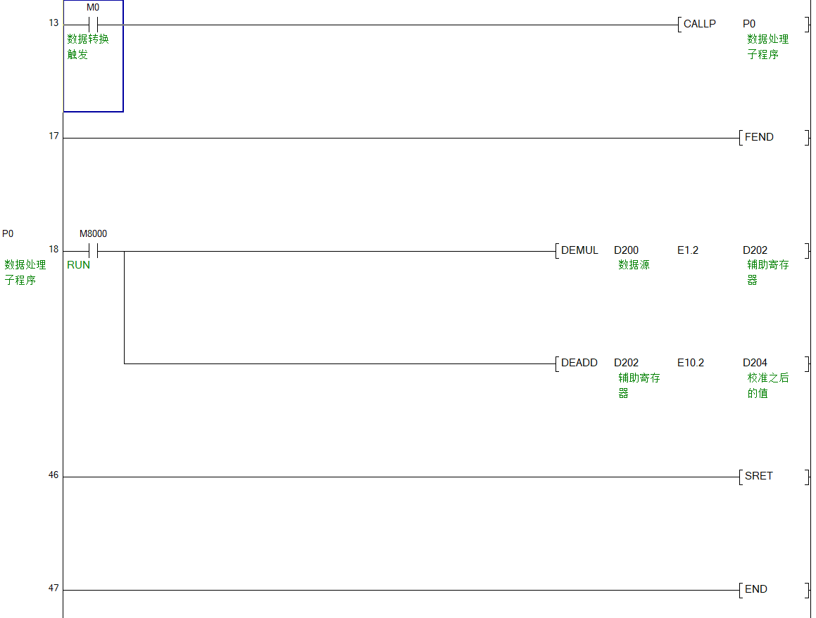 舉例說明:某工程項目中,需要對多組數據進行如下處理:D204=D200*1.2+10.2;D200為輸入的待處理數據,D204為處理完成后的數據值。M0為進入處理程序的觸發條件。