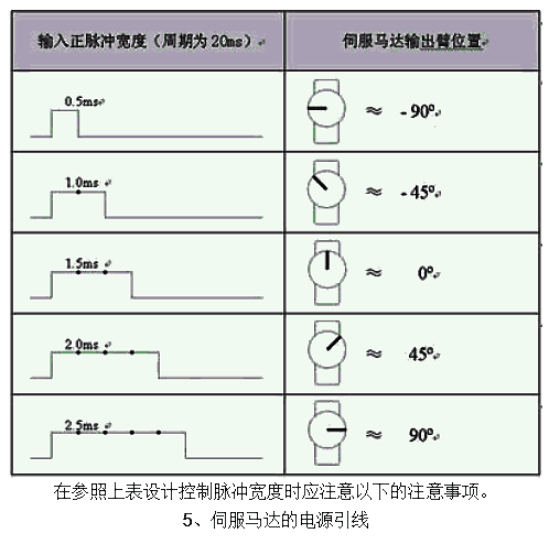 隔離(因?yàn)樗欧R達(dá)會產(chǎn)生噪音)。甚至小伺服馬達(dá)在重負(fù)載時(shí)也會拉低放大器的電壓,所以整 個(gè)系統(tǒng)的電源供應(yīng)的比例必須合理。 輸入一個(gè)周期性的正向脈沖信號,這個(gè)周期性脈沖信號的高電平時(shí)間通常在1ms—2ms之間,而低電平時(shí)間應(yīng)在5ms到20ms之間,并不很嚴(yán)格,下表表示出一個(gè)典型的20ms周期性脈沖 的正脈沖寬度與微型伺服馬達(dá)的輸出臂位置的關(guān)系: 在參照上表設(shè)計(jì)控制脈沖寬度時(shí)應(yīng)注意以下的注意事項(xiàng)。
