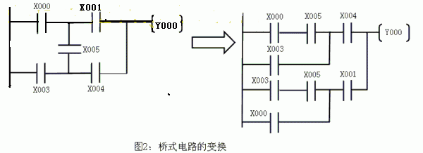 二,接點畫在水平線上,不可以畫在垂直線上,如下圖(a)中的接點X005與其它接點間的關系不能識別。對此類橋式電路,應按從左到右,從上到下的單向性原則,單獨畫出所有的去路。如圖(b)所示: