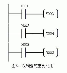 圖(b)中,X001和X002接點控制輔助繼電器M000,X003~X005接點控制輔助繼電器M001,再由兩個繼電器M000,M001接點的并聯組合去控制線圈Y000。這樣邏輯關系沒變,卻把雙線圈變成單線圈。