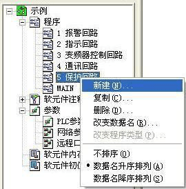 首先只要隨便右鍵單擊其中的任一項目,在彈出的窗口中選擇“新建”,然后在彈出的“新建”窗口中再選擇三菱PLC程序類型,數據名和索引就可以了。建立分類程序的方法很簡單如下圖所示: