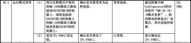 首先,可以確定的是,三菱伺服電機(jī)MR-J4系列報警“3E.1”是運(yùn)行模式異常的故障,與三菱伺服電機(jī)本身并無半毛錢的關(guān)系,具體三菱伺服報警說明如下圖所示: