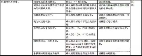 (下表對應MR-JE系列伺服放大器,更多伺服放大器故障排查方法請參考相應的伺服放大器技術資料集(故障排除篇))