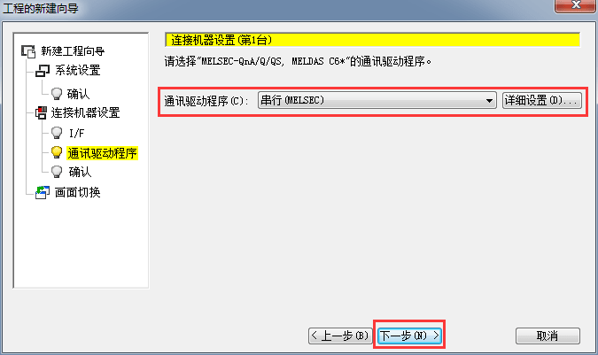 2.1.6 設置通訊啟動驅動,(串行MELSEC)默認,后單擊[下一步]