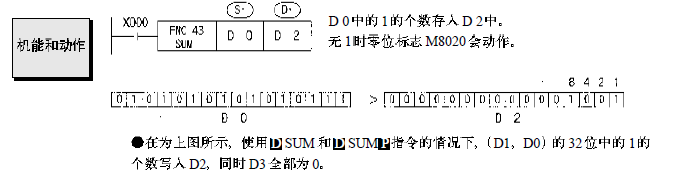 三菱的ON位數統計指令SUM (D)SUM(P)指令,該指令是用來統計指定元件中1的個數。如圖4所示,當X0有效時執行SUM指令,將源操作數D0中1的個數送入目標操作數[D2中,若D0中沒有1,則零標志M8020將置1。