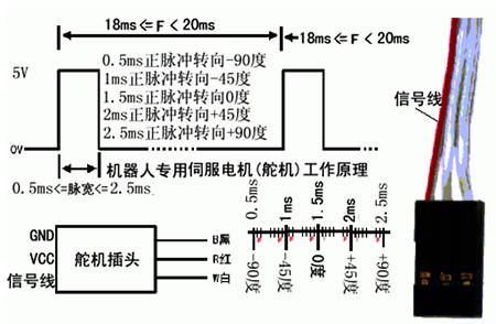伺服馬達(dá)的電源引線 電源引線有三條,如圖中所示。伺服馬達(dá)三條線中紅色的線是控制線,接到控制芯片上。中間的 是SERVO工作電源線,一般工作電源是5V。第三條是地線。