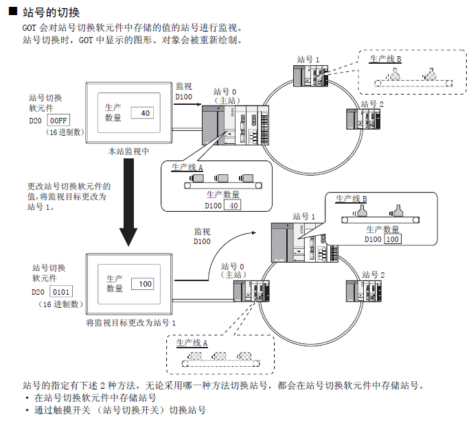 二:實際使用中根據不同機臺切換站號即可,三菱觸摸屏支持站號切換,將站號規定為軟元件從而靈活設置站號的切換