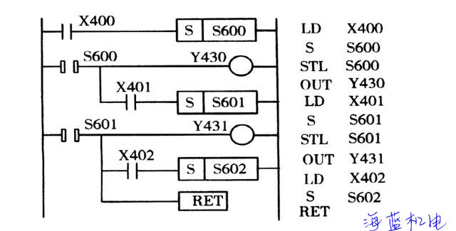 圖1 -11 所示,當(dāng)觸頭 X400 閉合時(shí),狀態(tài)器S600 得電并內(nèi)部自鎖,其步進(jìn)輸出觸頭
