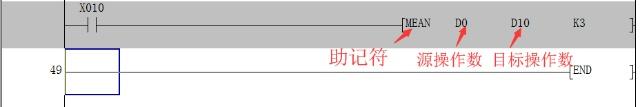 上圖中的例子就是說當X10觸點接通,執行命令MEAN,求3個數據寄存器D0~D2中的數據的平均值,并將結果存到D10中去。